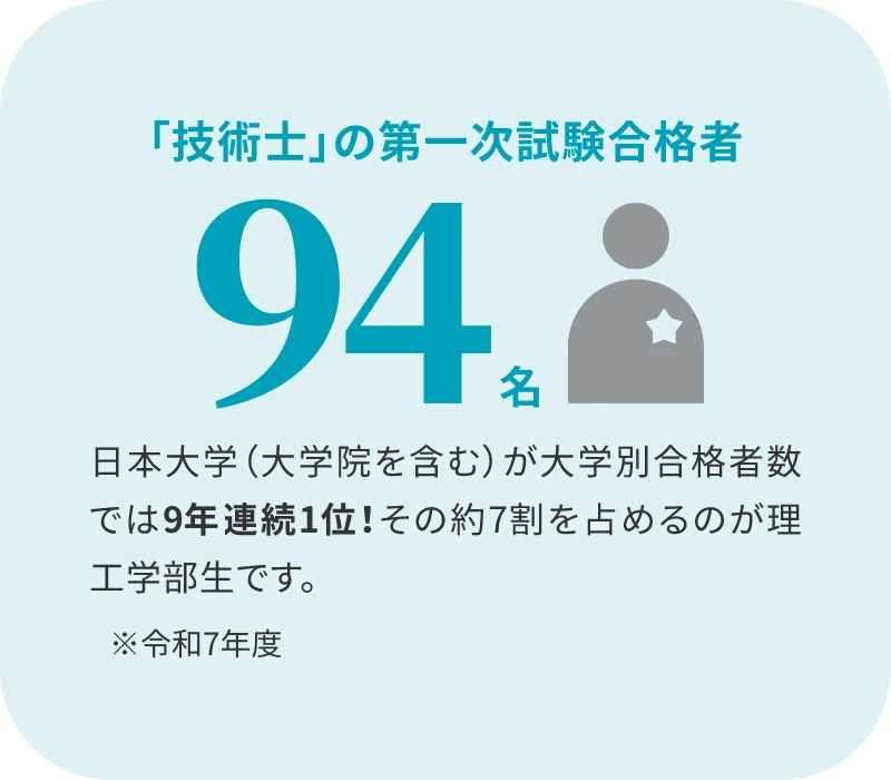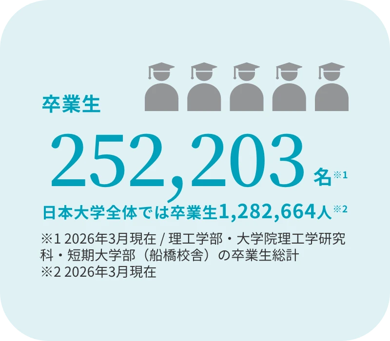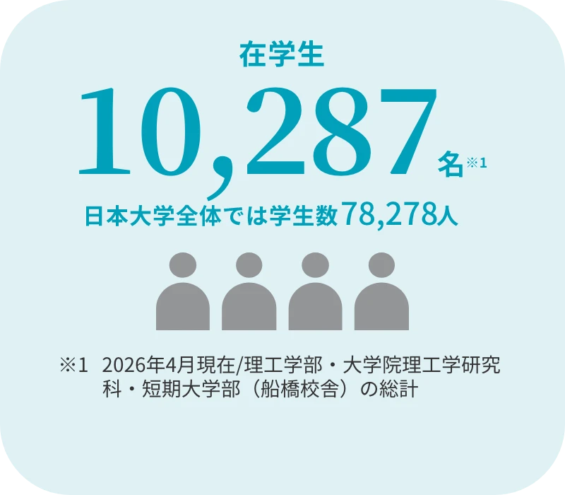 中でも理工学部は,学科数,学生数,教職員数ともトップクラスの規模を誇り,1920(大正9)年,前身である日本大学高等工学校の開設以来これまでに国内外で活躍する24万人をこえる技術者を育成してきました。