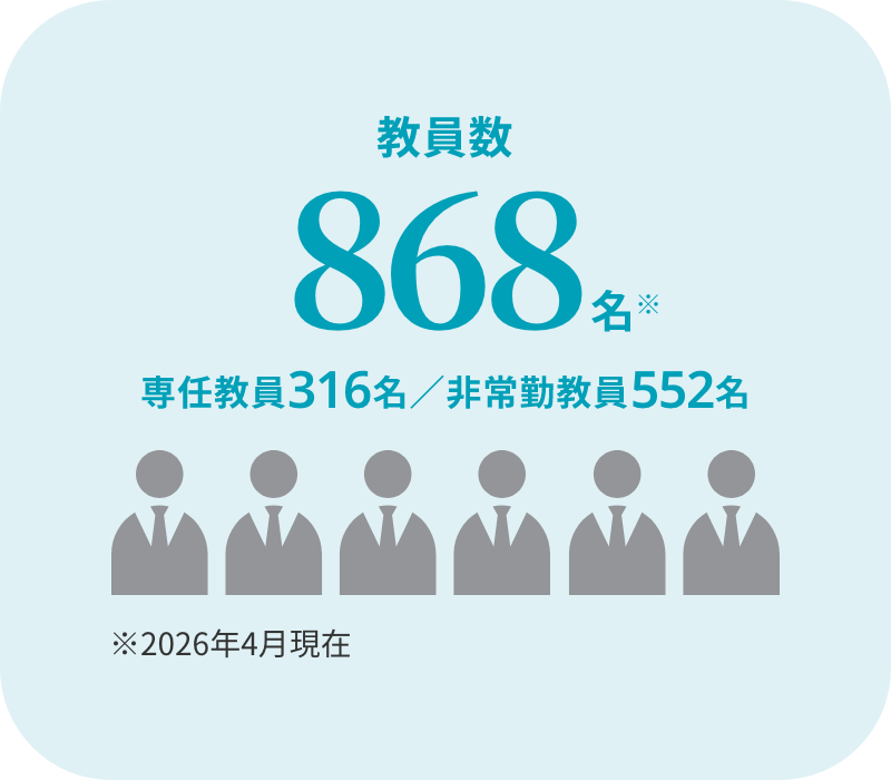 100年に及ぶ歴史と知識の蓄積は,近年多様化している学生たちのニーズにも応え得る深さと豊かさに満ち,その中で自分の進むべき道を選択する学生たちに,専任教職員と非常勤講師等含めて868人にものぼる教員が手を差し伸べます。学生約10人に教職員1人というきめ細かい対応と,さまざまな価値観や個性との出会いにより,一人ひとりの学生が,自身の個性を十分に活かした道に進むことができるのです。