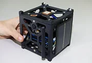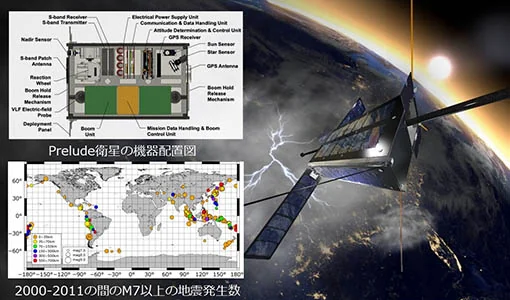 写真は,現在開発中の地震に先行する現象を解明する約30㎝x20㎝x10㎝の超小型衛星Preludeです.