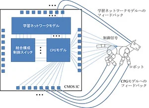 CPG (Central Pattern Generator) は,人間や動物の脊柱における神経回路(ニューラルネットワーク)です。このCPG の機能をロボットに応用することで,不整地に対し,自律的に適応するロボットが作成可能であると考えられます。