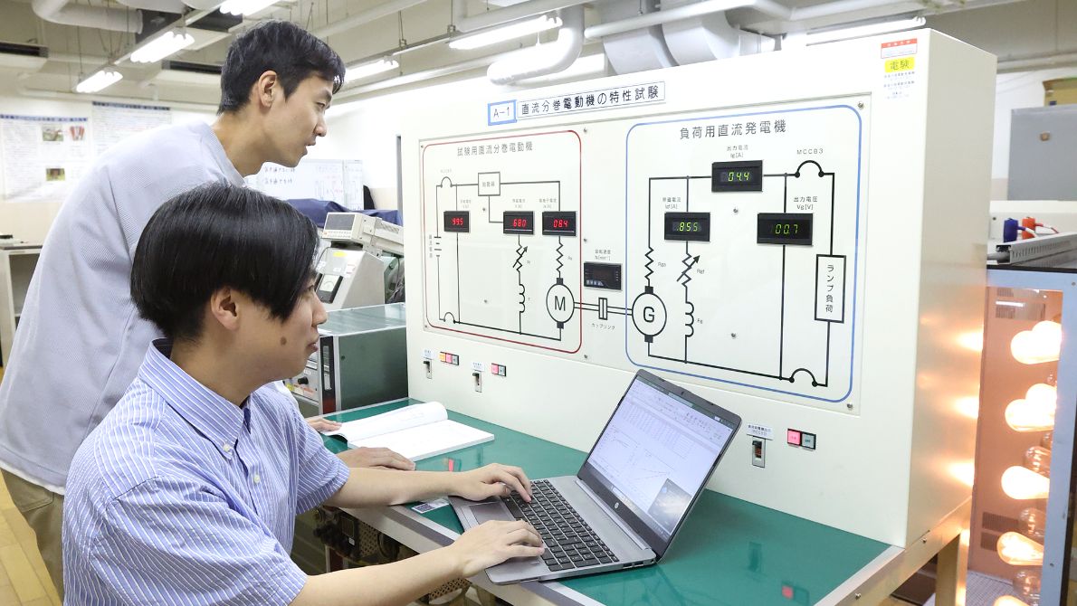 電気工学科ではエネルギー・制御、通信・情報・音響、材料・エレクトロニクスの3分野を中心に幅広いカリキュラムと実験・実習で基礎から応用まで学び、即戦力となる技術を修得できます。卒業生は大学院進学のほか、電力会社、電子機器メーカー、自動車メーカー、通信・IT企業等多様な業界で活躍しています。