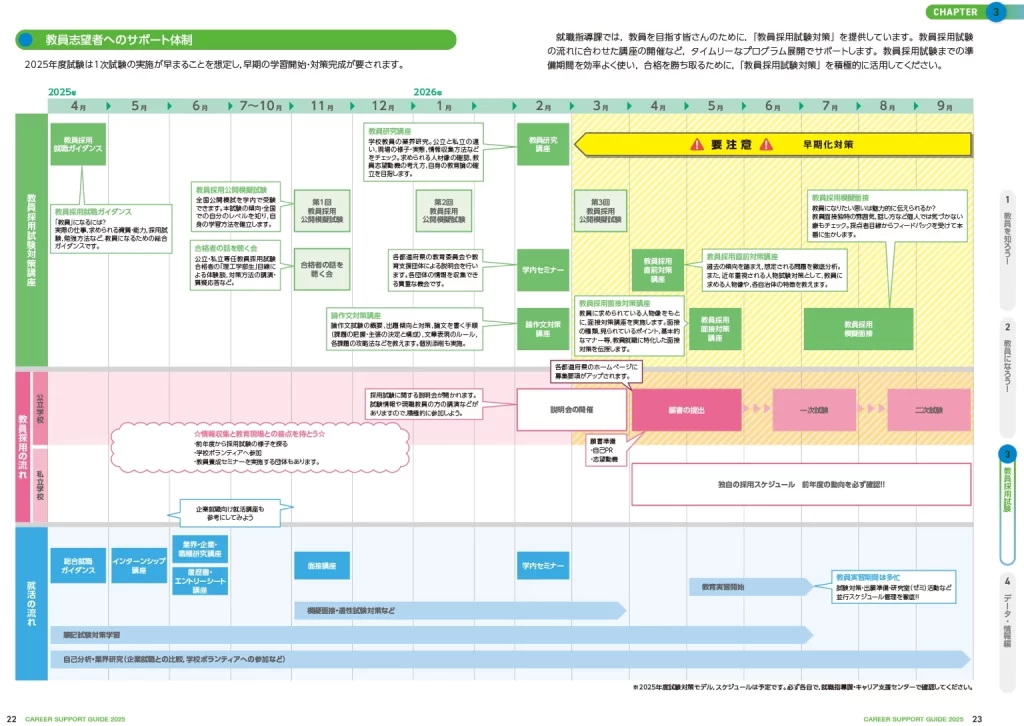 | 学内セミナー | 2月 | 各都道府県の教育委員会や教育支援団体による説明会を行います。 各団体の情報を収集できる貴重な機会です。 |