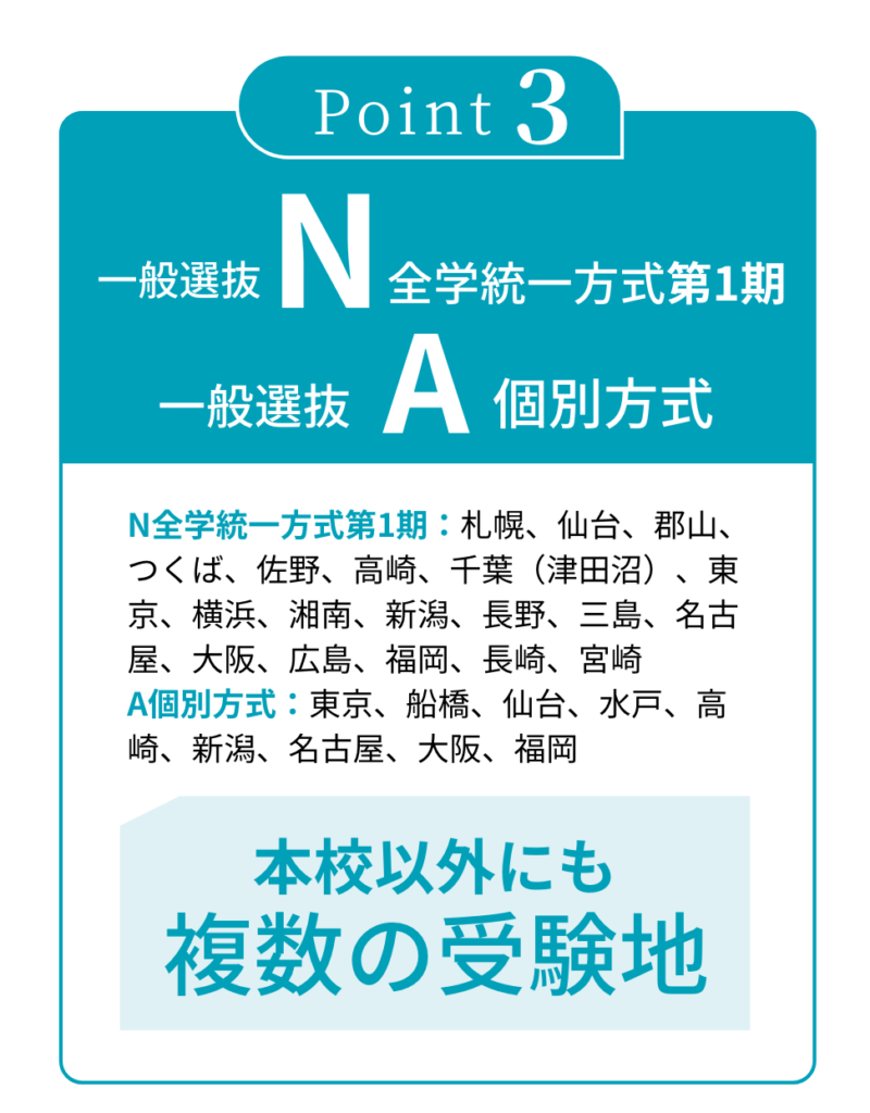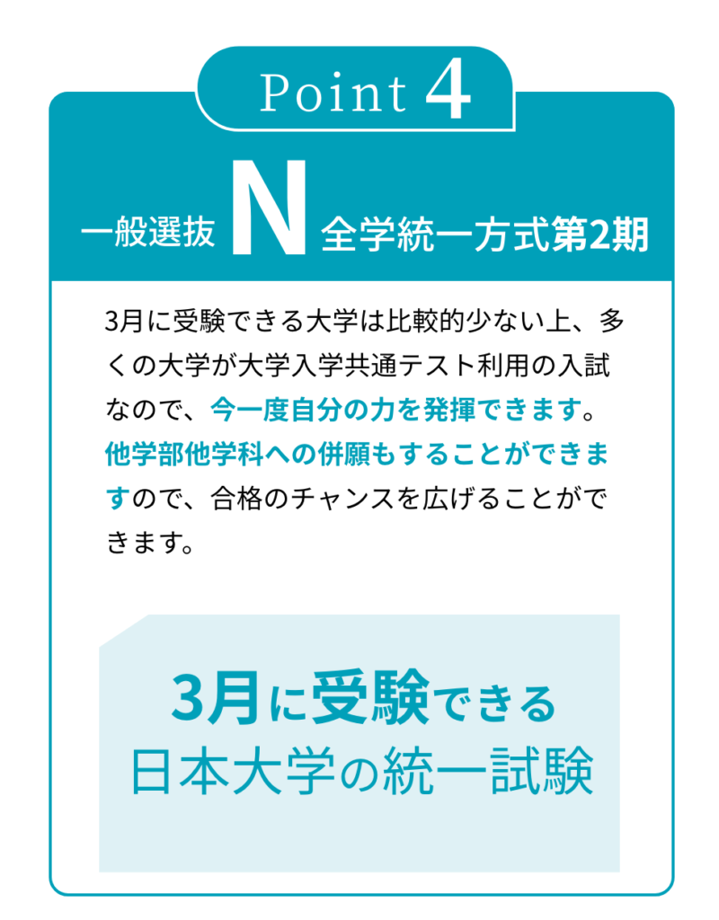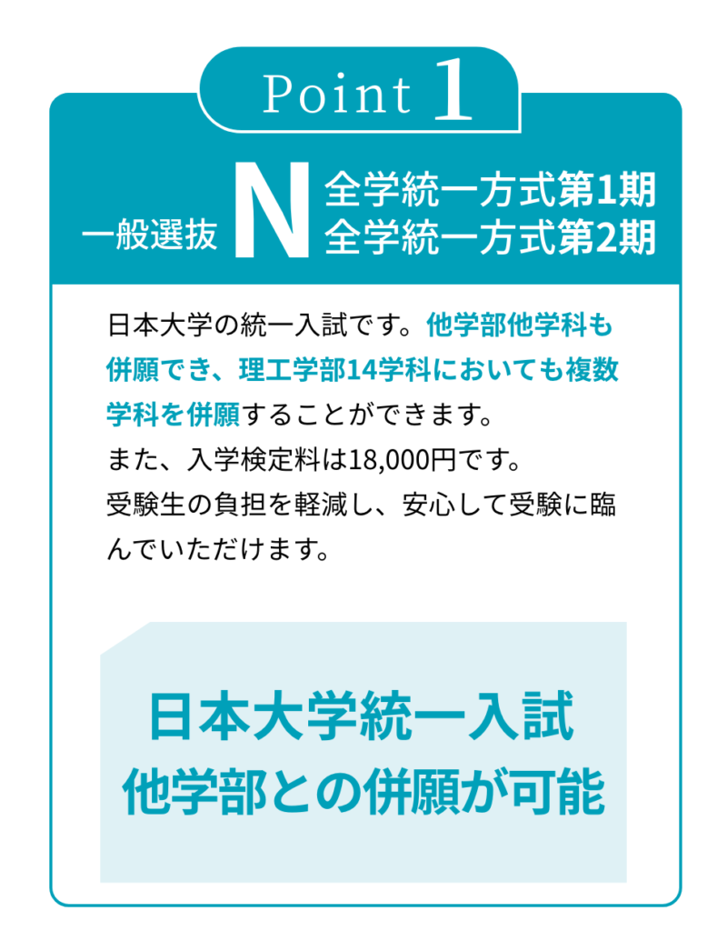 大学受験の本命・併願の出願校決定では,試験科目や難易度,日程,会場等の選択が重要なポイントと言われています。日本大学理工学部の入学者選抜には,それぞれ特長を持った方式があります。入試の多彩なポイントをご紹介しますので,それぞれの選抜方法,試験時期の特徴をおさえて,自分の得意な面をうまく発揮して,合格を勝ち取ろう!