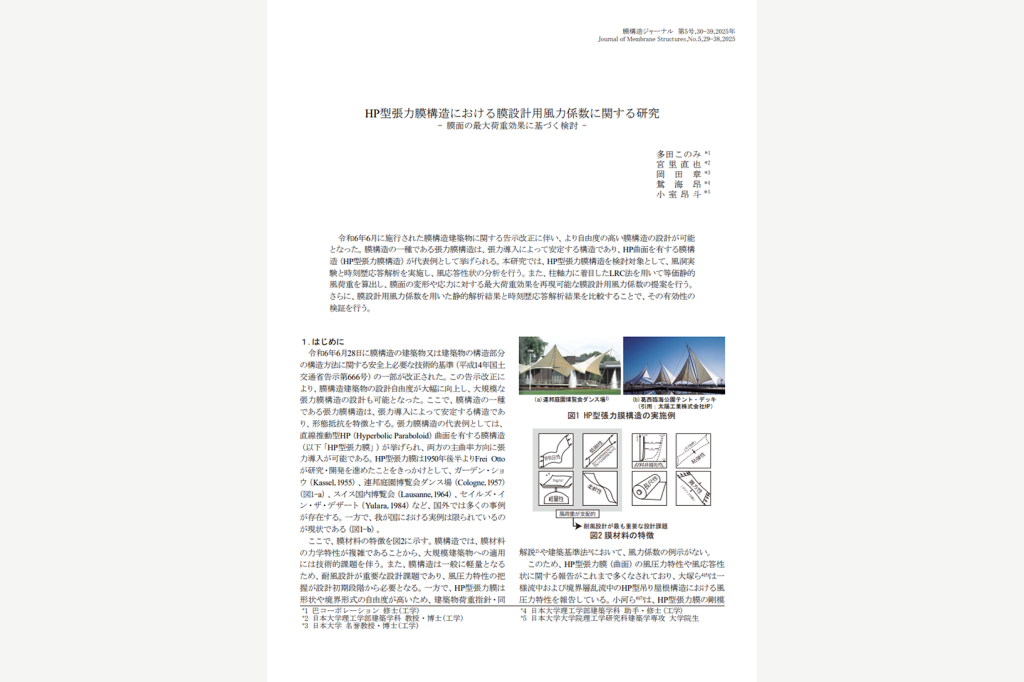 日本膜構造協会発行の査読付き論文膜構造ジャーナル2025に博士前期課程2年の小室昂斗さん(空間構造デザイン研究室所属)が共同著者である「HP型張力膜構造における膜設計用風力係数に関する研究 - 膜面の最大荷重効果に基づく検討 -」が掲載されました。