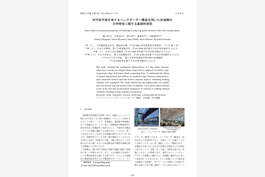 土木学会発行の査読付き論文 構造工学論文集A 72A巻に博士前期課程2年(当時)の山﨑瑠真さん(空間構造デザイン研究室所属)が共同著者である「半円形平面を有するリングガーダー構造を用いた歩道橋の力学特性に関する基礎的研究」が掲載されました。