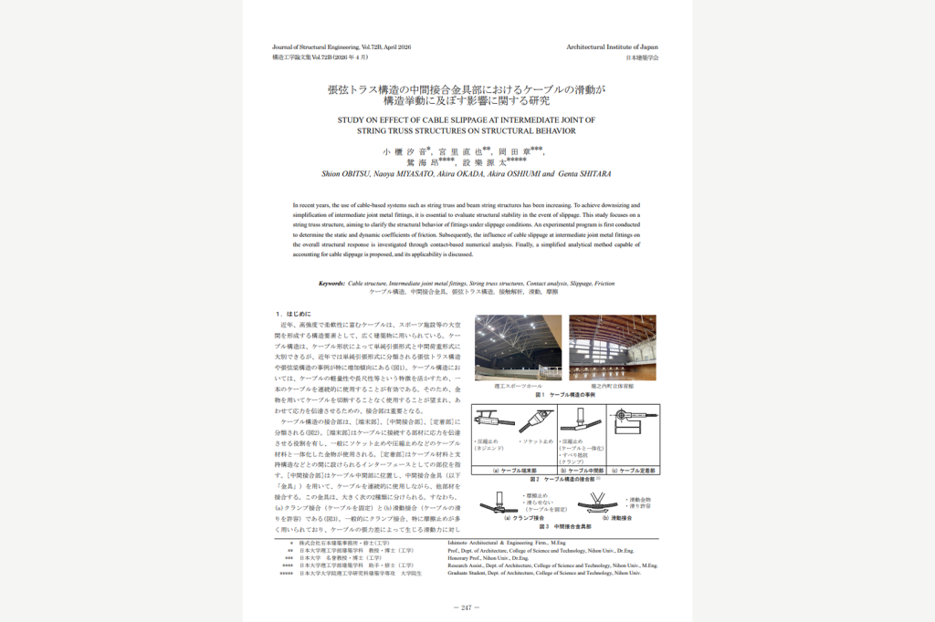 日本建築学会発行の査読付き論文構造工学論文集72B巻に博士前期課程2年の設樂源太さん(空間構造デザイン研究室所属)が共同著者である「張弦トラス構造の中間接合金具部におけるケーブルの滑動が構造挙動に及ぼす影響に関する研究」が掲載されました。