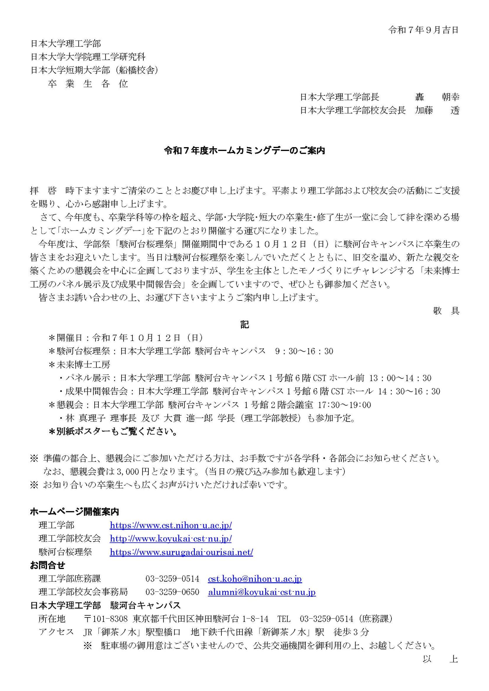 【卒業生・修了生の皆さまへ】母校に帰ろう!10月12日(日) 日本大学理工学部ホームカミングデー 2025開催(駿河台キャンパス)