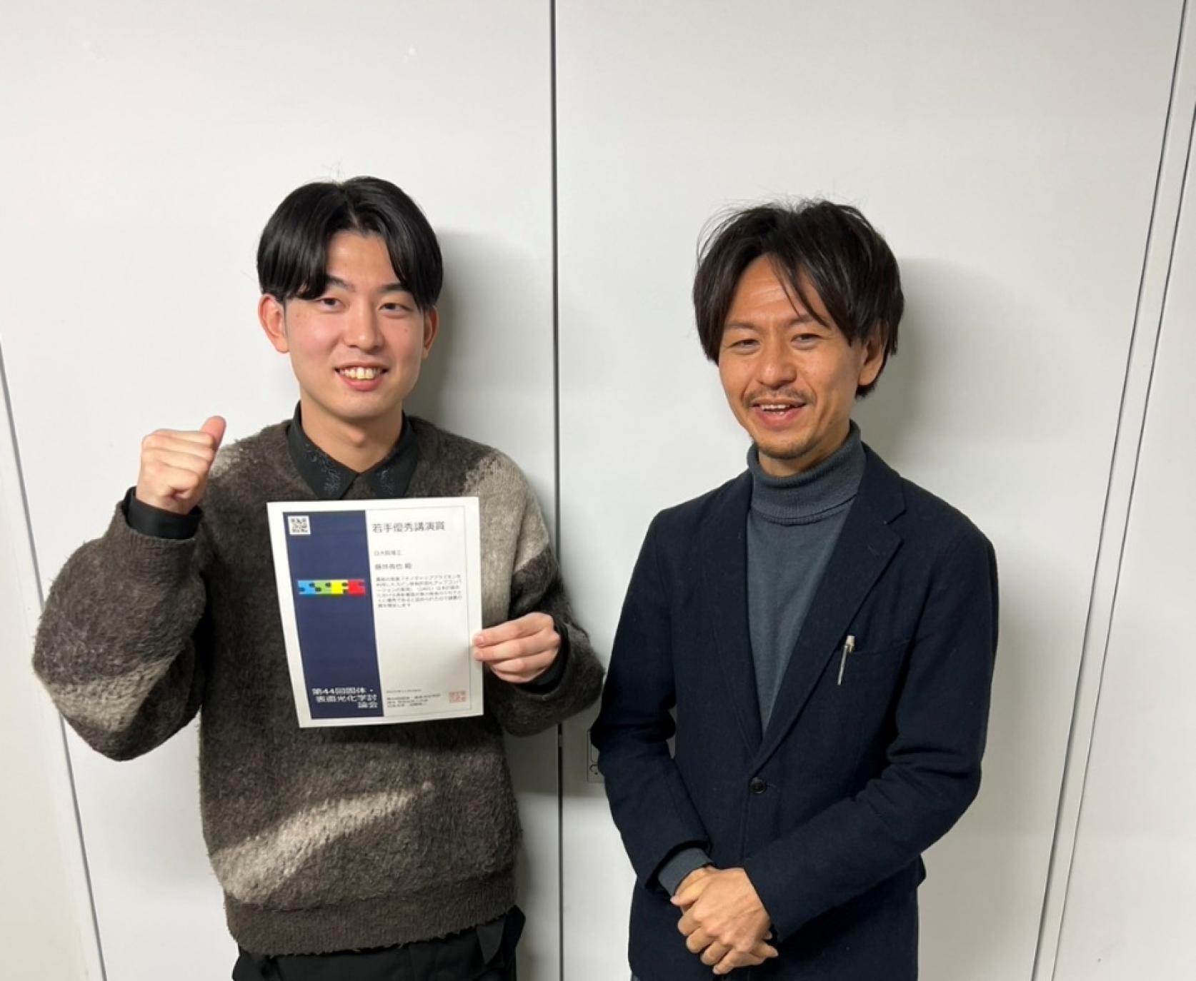 物質応用化学専攻博士前期課程1年の藤井侑也さんが、第44回固体・表面光化学討論会において、若手優秀講演賞を受賞しました。