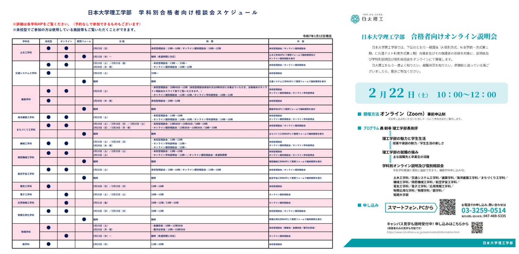 「学科別合格者相談会」「合格者向けオンライン説明会」「学校見学」のご案内