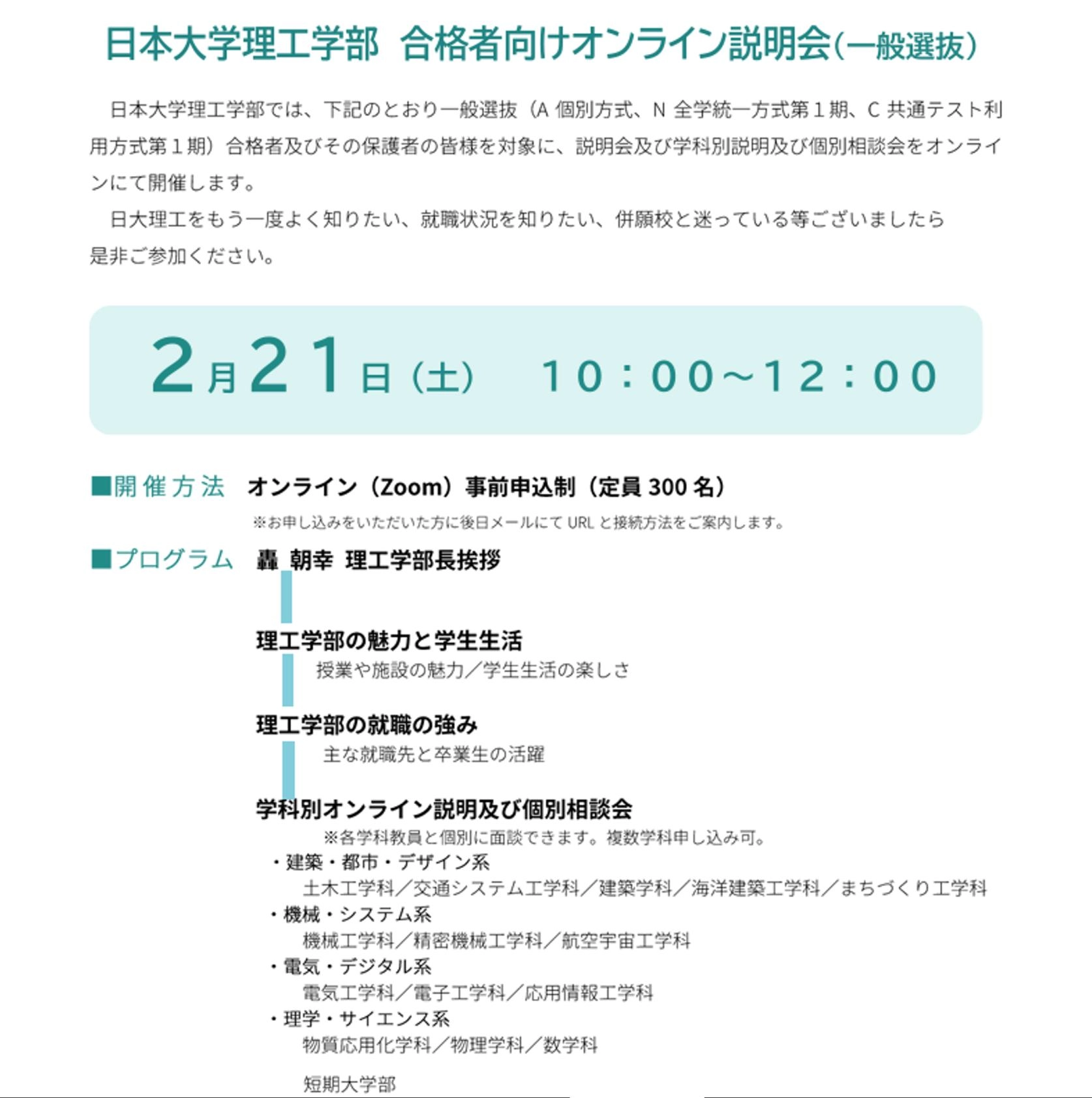 【12月14日(土)開催】日本大学理工学部 オンライン入試説明会(一般選抜)事前申込制