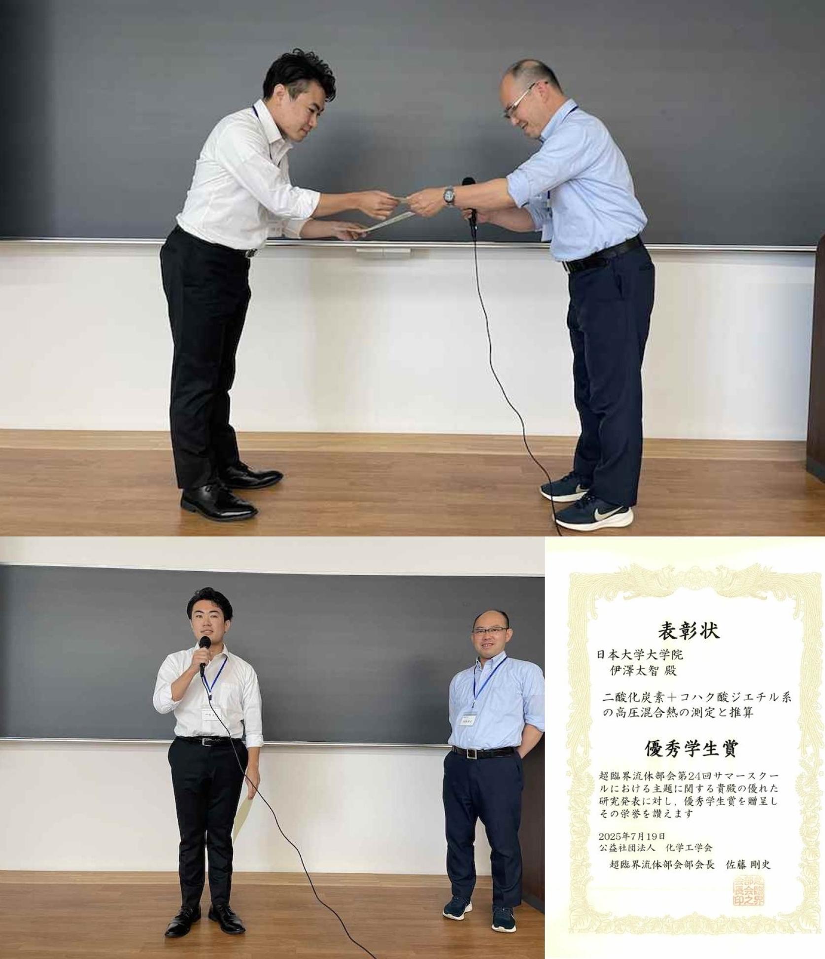 物質応用化学専攻博士前期課程1年の伊澤太智さんが、化学工学会超臨界流体部会第24回サマースクールにおいて、優秀学生賞を受賞しました。