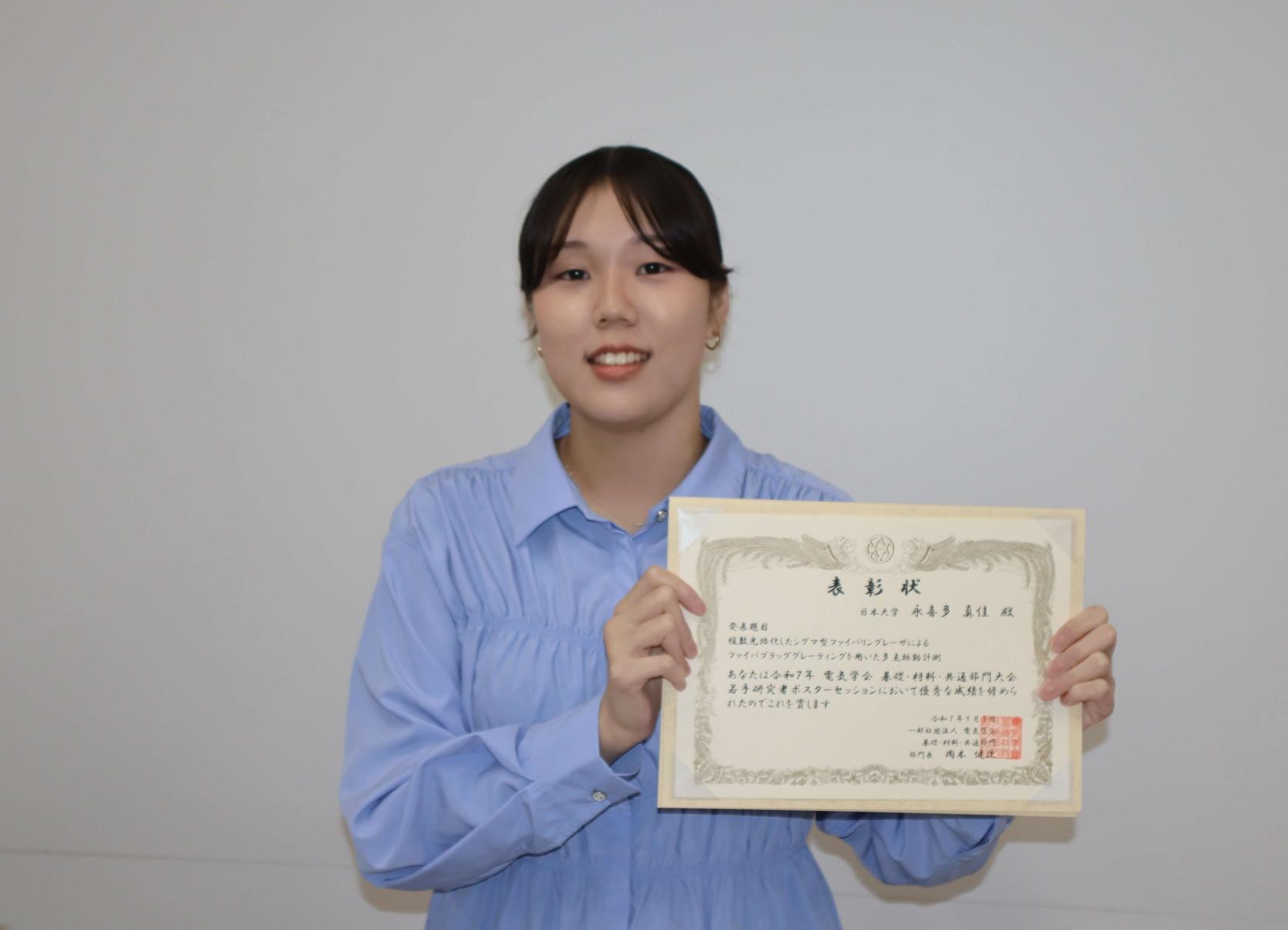 2025年9月3日に芝浦工業大学で開催された令和7年電気学会・基礎・材料・共通部門大会にて、電気工学専攻博士前期課程2年の永喜多真佳さんが「若手ポスター優秀賞」を受賞しました。