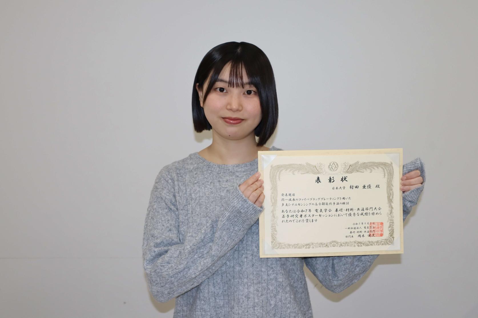 電気工学専攻博士前期課程2年の村田亜優さんが、電気学会A部門大会にて「若手ポスター優秀賞」を受賞しました。