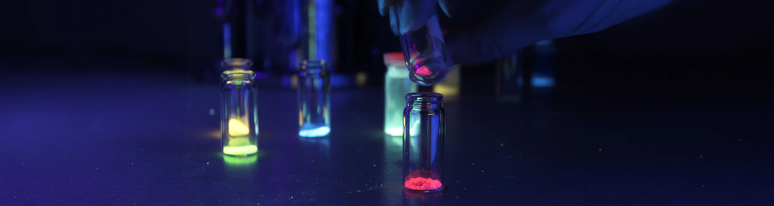 母体結晶に希土類イオンや重金属イオンを添加することにより蛍光体を合成することができます。この蛍光体は外部からの刺激を停止すると発光しなくなりますが、母体結晶を硫化ストロンチウムとし,Ce 3+ とEu 2+ を付活した蛍光体は可視光線を20分間照射することにより1000分間以上赤色の光を出し続けます。
