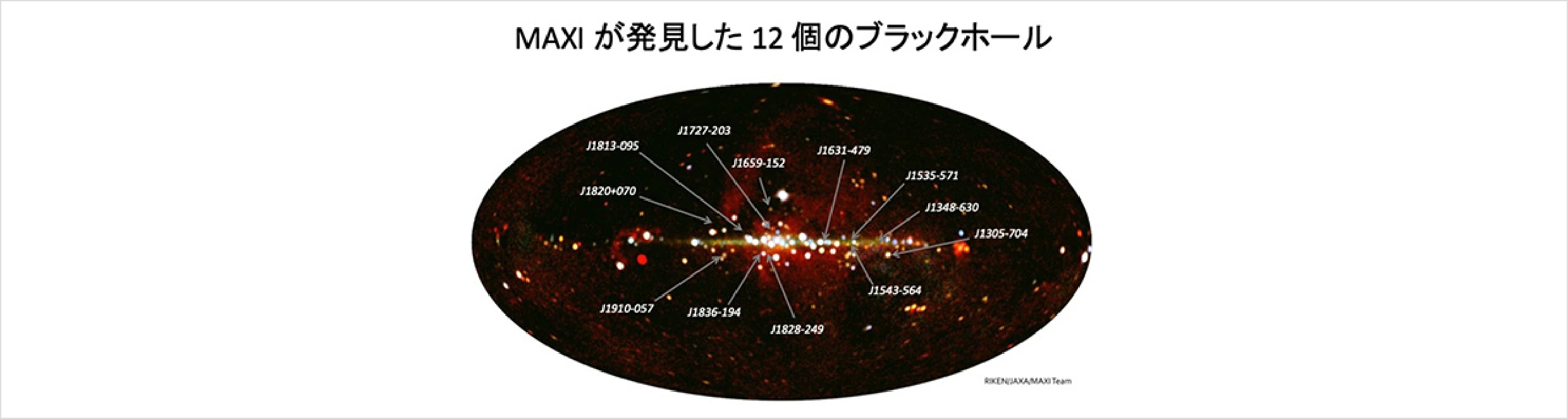 2009年以来、JAXA と理化学研究所をはじめとする国内の大学研究機関とともに、国際宇宙ステーションに搭載された全天X線監視装置 MAXI (マキシ) を用いて、突発天体と呼ばれる突然輝き出す新天体の探査を行なっています。研究室で開発した「突発天体発見システム」によりすでに 10を超えるブラックホールを新たに発見し、国内外の研究機関と協力してそれらの天体の解明を行なっています。