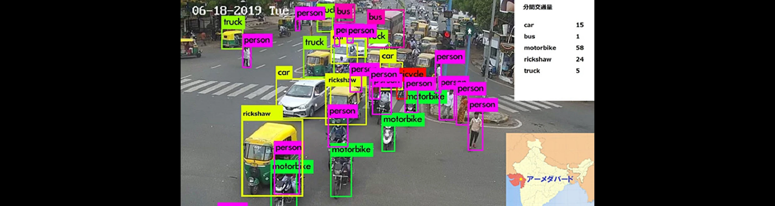 安全かつ効率的に人やモノが移動できるようなると、時間や利便性だけでなく、世界的課題になっているCO2削減に貢献できます。分析のための情報獲得技術として画像センシングがあります。カメラを使って走行車両を撮影し、人工知能の一つである画像認識によりバイクや乗用車、トラック、バスなどの車種を区別しながら、瞬時に高精度で計数する研究を行っています。
